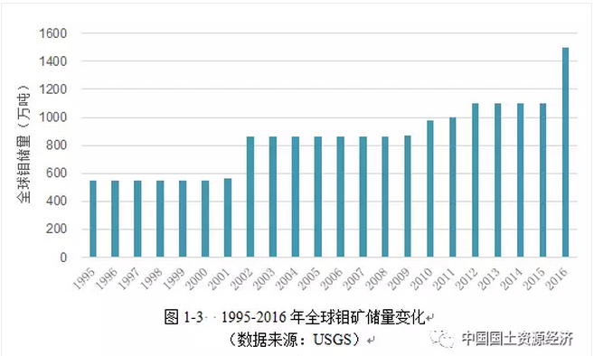 據(jù)美國地質(zhì)調(diào)查局統(tǒng)計(jì),過去的二十年間全球鉬礦儲(chǔ)量總體呈上升趨勢(shì)。1995—2001年全球鉬礦儲(chǔ)量保持在550萬噸左右,2002—2009年增長至860萬噸,2010年以后穩(wěn)步增長,2016年增至1500萬噸,較1995年增加了950萬噸(圖3)。其中儲(chǔ)量增長最多的國家是中國。