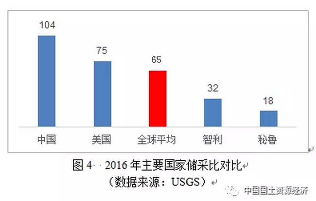 2016年全球鉬礦儲(chǔ)量1500萬噸,年開采量23萬噸(金屬量),據(jù)此測(cè)算全球鉬礦儲(chǔ)采比為65年,足以保障未來全球經(jīng)濟(jì)發(fā)展需要。四大資源國鉬礦儲(chǔ)采比為:中國104年、美國75年、智利32年、秘魯18年,中國和美國保障程度高于全球平均水平(圖4)。