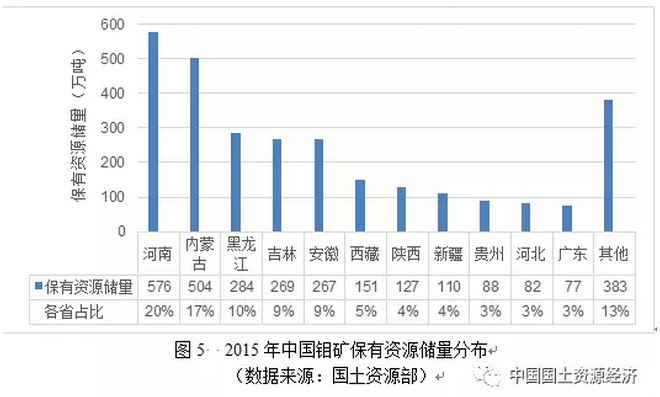 據(jù)國土資源部統(tǒng)計(jì)[,截至2015年底中國查明鉬礦區(qū)749處,保有資源儲(chǔ)量2918萬噸(金屬量,下同)。其中基礎(chǔ)儲(chǔ)量833萬噸、資源量2085萬噸。按保有資源儲(chǔ)量統(tǒng)計(jì),排名前10位的省區(qū)依次為河南、內(nèi)蒙古、黑龍江、吉林、安徽、西藏、陜西、貴州、河北和廣東,10省區(qū)保有資源儲(chǔ)量合計(jì)約占全國總量的83%。其中,排名前五位的省區(qū)合計(jì)約占全國總量的65%,資源分布相對(duì)集中(圖5)。