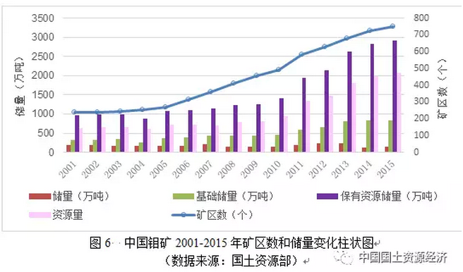據(jù)國土資源部統(tǒng)計(jì),2001—2015年中國查明的鉬礦區(qū)數(shù)量由237個(gè)增加到749個(gè),增加了512個(gè);鉬礦保有資源儲(chǔ)量從962萬噸增加到2918萬噸,增量達(dá)1956萬噸,年均新增鉬礦保有資源儲(chǔ)量140萬噸,相當(dāng)于每年新發(fā)現(xiàn)2個(gè)超大型礦床(圖6)。