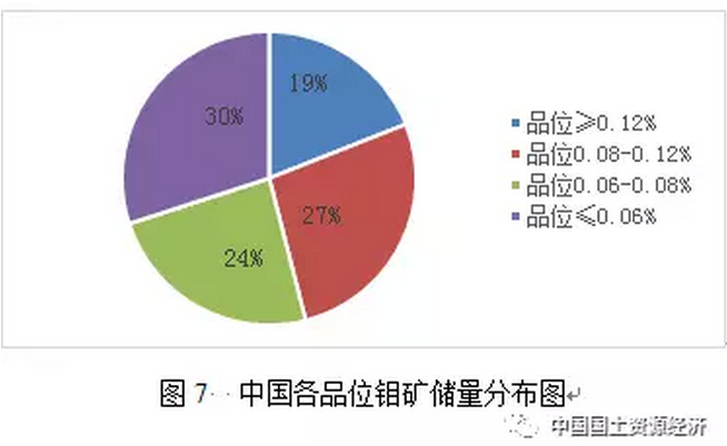 我國鉬礦品位大于0.12%的較富鉬礦僅占19%;品位大于0.08%的鉬礦占46%,即達(dá)到鉬礦坑采工業(yè)品位上限的資源儲(chǔ)量不足總量的一半;品位為0.06%~0.08%的鉬礦占24%,品位小于0.06%的占30%(圖7)。